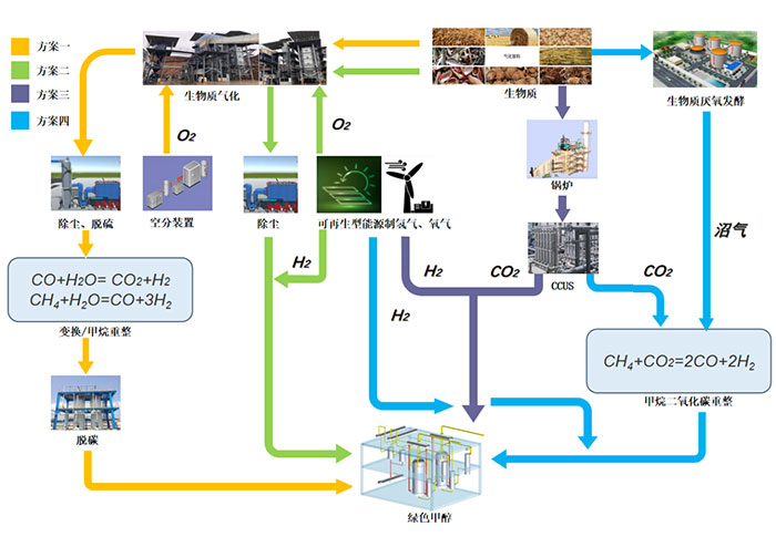 由生物质产生的含有一氧化碳、二氧化碳、氢气的新鲜气经压缩机加压后,与循环机出口的气体混合,混合气体与甲醇反应器出口的合成气进行换热后进入反应器;在可控移热甲醇合成塔内进行甲醇合成反应,反应热由壳程的锅炉水移出床层并副产饱和蒸汽,出合成塔的气体进入热交换器同入塔气换热;换热后的合成气再经水冷器冷却,进入醇分离器进行气液分离,液体甲醇进入闪蒸槽闪蒸后得到粗甲醇;分离醇后的气体进入循环机增压后与新鲜气混合,再进行循环反应。